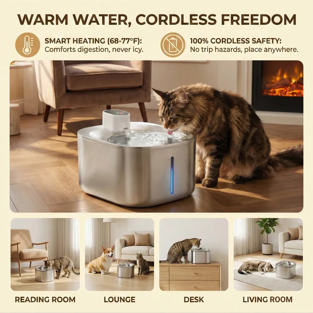 Eliminate cord clutter and place it anywhere. Automatically maintains a refreshing 68–77°F (20–25°C) for your pet's health.
