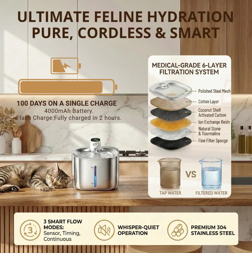 One full charge powers 60–100 days of continuous filtration. Skip the constant plug-ins and keep your pet hydrated effortlessly.
